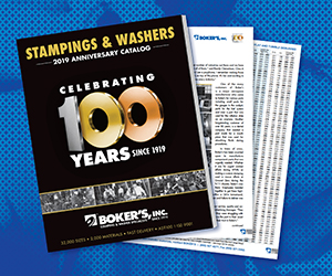 Boker’s, Inc. maintains a Quality Management System that is AS 9100:2016 and ISO 9001:2015 certified, and is a woman-owned manufacturer of precision stampings and non-standard washers and spacers. To request a complimentary copy of Boker’s Stamping & Washer Catalog contact: Boker’s, Inc., 3104 Snelling Avenue, Minneapolis, MN 55406-1937; call 612-729-9365 or (TOLL-FREE) 800-927-4377 or visit www.bokers.com.